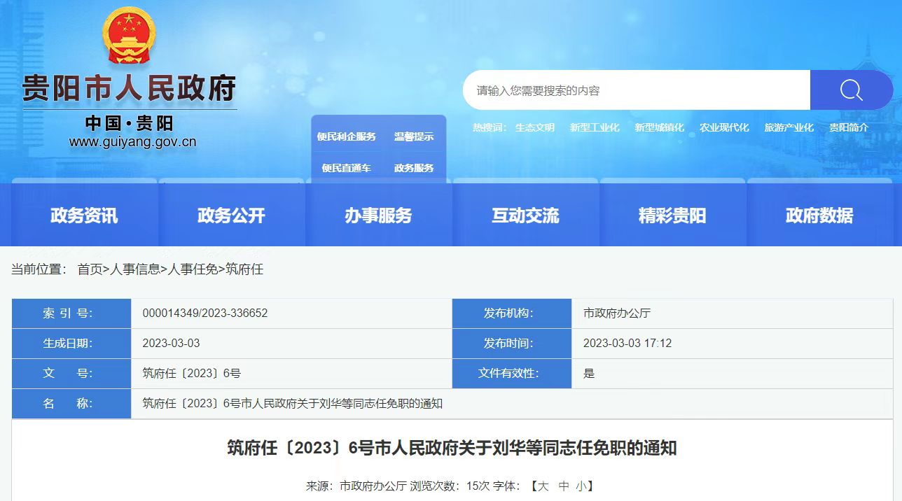 刘 华同志任贵阳市人民政府政务服务中心主任;