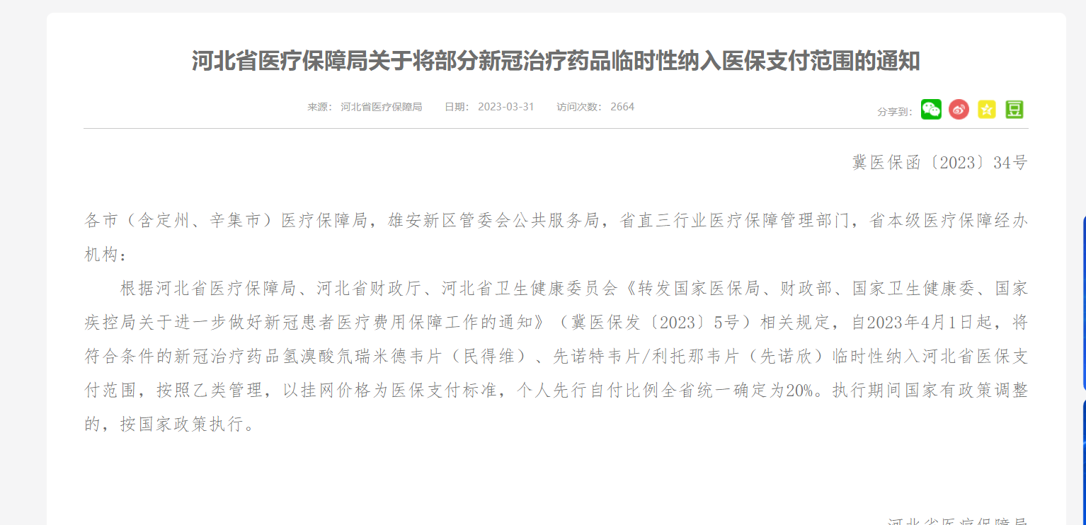 以河北为例,其个人先行自付比例远高于南京:河北省医保局曾发布《关于将部分新冠治疗药品临时性纳入医保支付范围的通知》,自2023年4月1日起,河北省也将符合条件的新冠治疗药品民得维、先诺欣临时性纳入河北省医保支付范围,按照乙类管理,以挂网价格为医保支付标准,个人先行自付比例全省统一确定为20%。