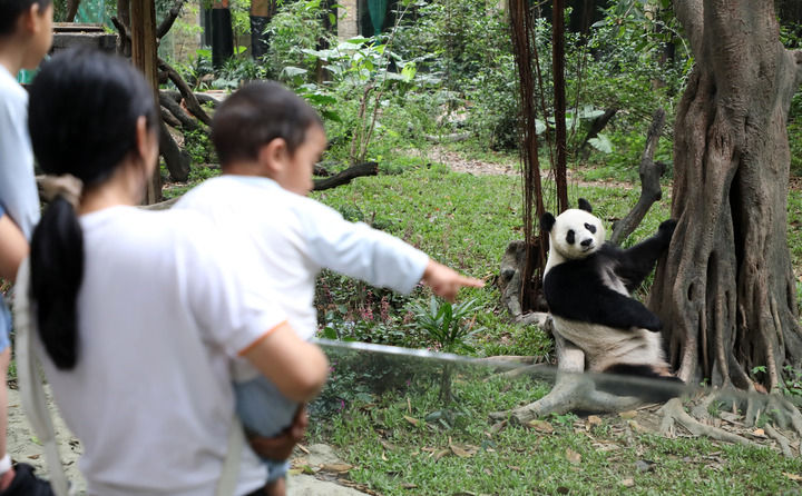 4月29日,在广东广州长隆野生动物世界,游客在观赏大熊猫。新华社记者 黄国保 摄