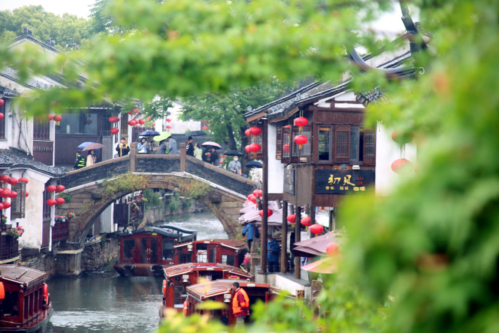 4月29日,游客在江苏苏州山塘古街游览。新华社发(王建康摄)