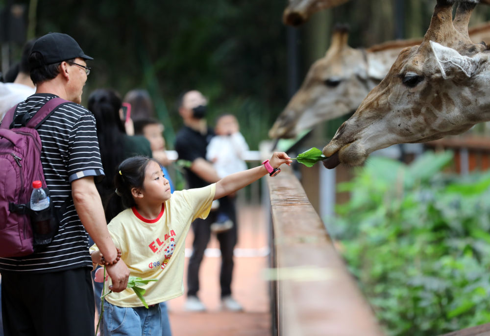 4月29日,在广东广州长隆野生动物世界,小朋友投喂长颈鹿。新华社记者 黄国保 摄