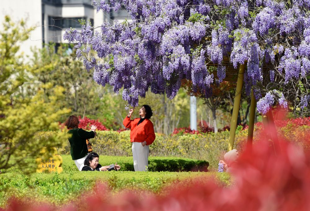 4月29日,游人在山东省胶州市的青岛大沽河省级生态旅游度假区游玩拍照。新华社发(王昭脉摄)