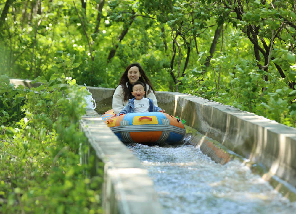 4月29日,游客在山东省临沂市沂南县铜井镇竹泉村体验丛林漂流。新华社发(王彦冰摄)