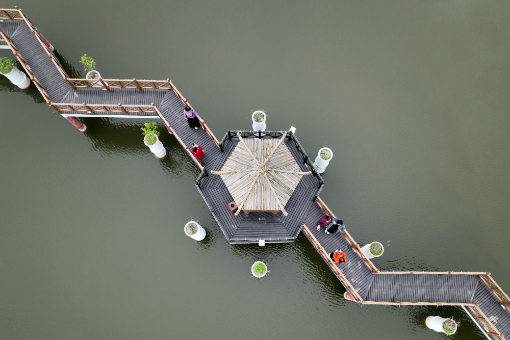4月29日,游客在江苏省宝应县射阳湖镇游玩(无人机照片)。新华社发(沈冬兵摄)