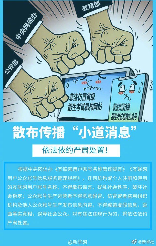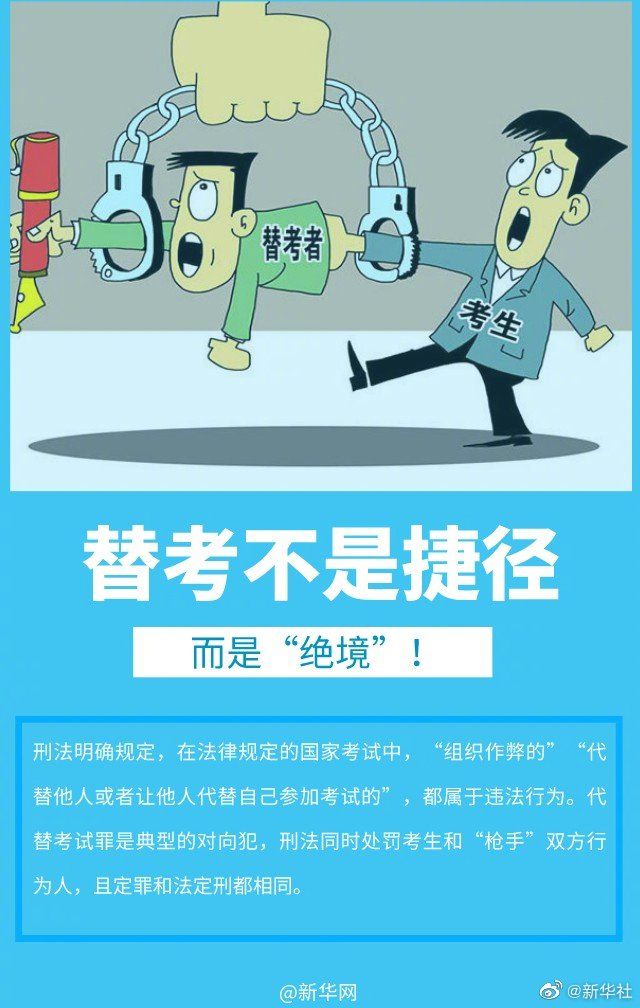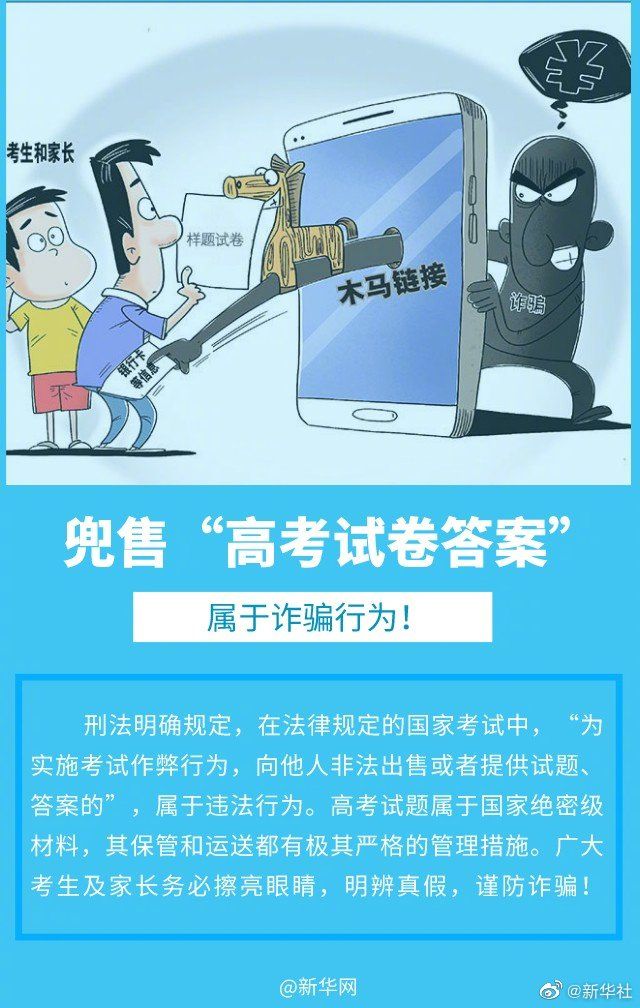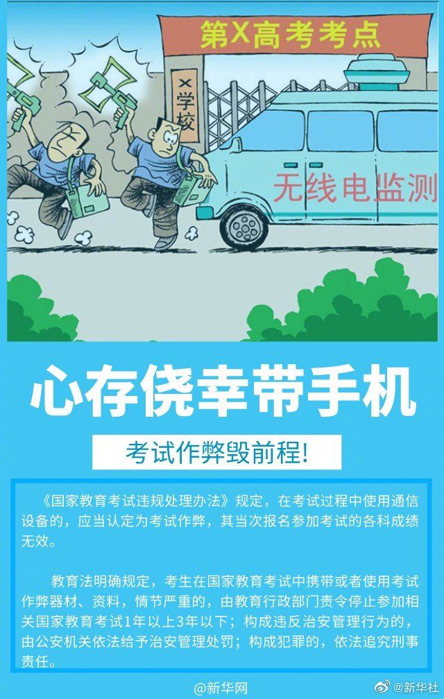 【警惕!6种涉考违法犯罪行为将被严打】距2022高考还剩1天,有些不良机构或不法分子妄图借高考之机牟取不法利益。广大考生和家长要增强法律意识,诚信考试,切勿心存侥幸。①组织高考作弊,属于严重违法!②替考不是捷径,而是“绝境”!③心存侥幸带手机,考试作弊毁前程!④发布虚假广告宣传,贻误宝贵复习时间!⑤兜售“高考试卷答案”,属于诈骗行为!⑥散布传播“小道消息”,依法依约严肃处置!