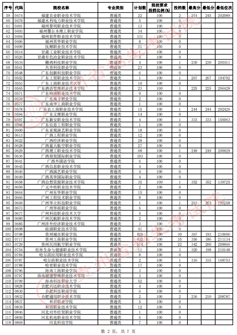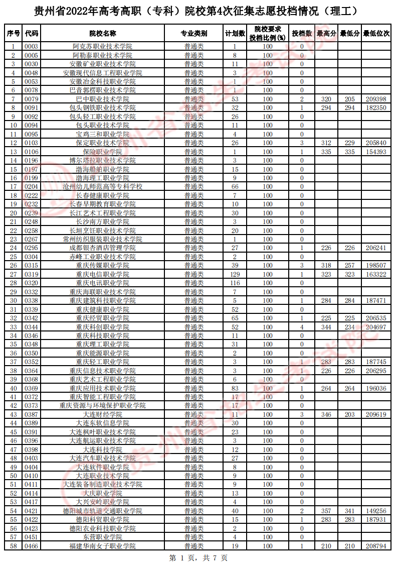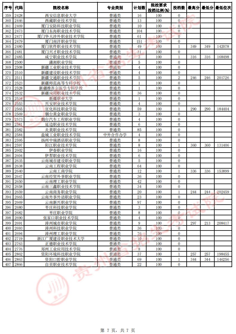 贵州省高考高职(专科)院校第4次征集志愿投档情况(文史类)
