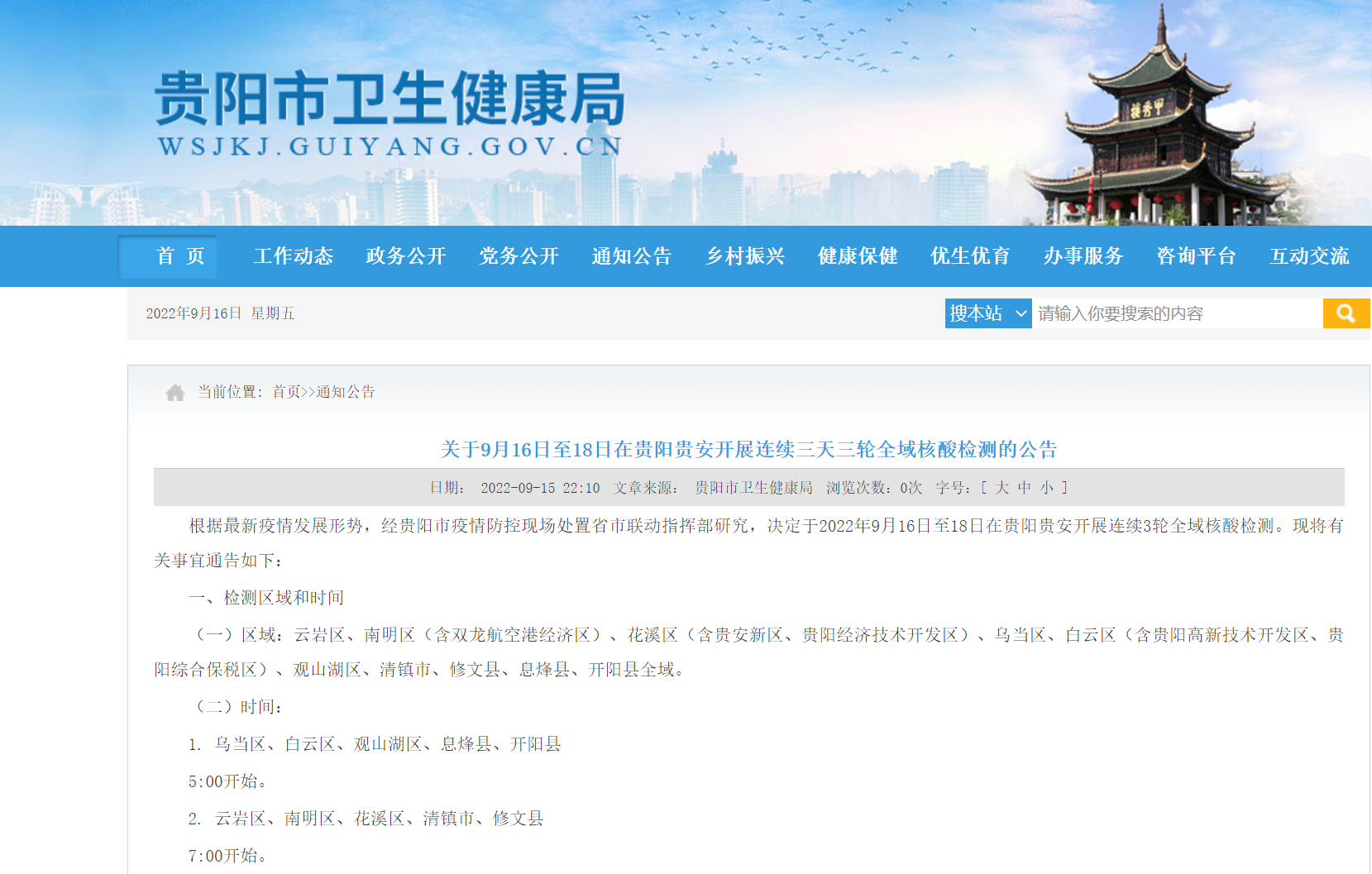 9月15日,贵阳市卫健局发布了《关于9月16日至18日在贵阳贵安开展连续三天三轮全域核酸检测的公告》,根据最新疫情发展形势,经贵阳市疫情防控现场处置省市联动指挥部研究,决定于2022年9月16日至18日在贵阳贵安开展连续3轮全域核酸检测。