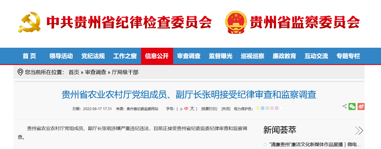 贵州省农业农村厅党组成员、副厅长张明涉嫌严重违纪违法,目前正接受贵州省纪委监委纪律审查和监察调查。