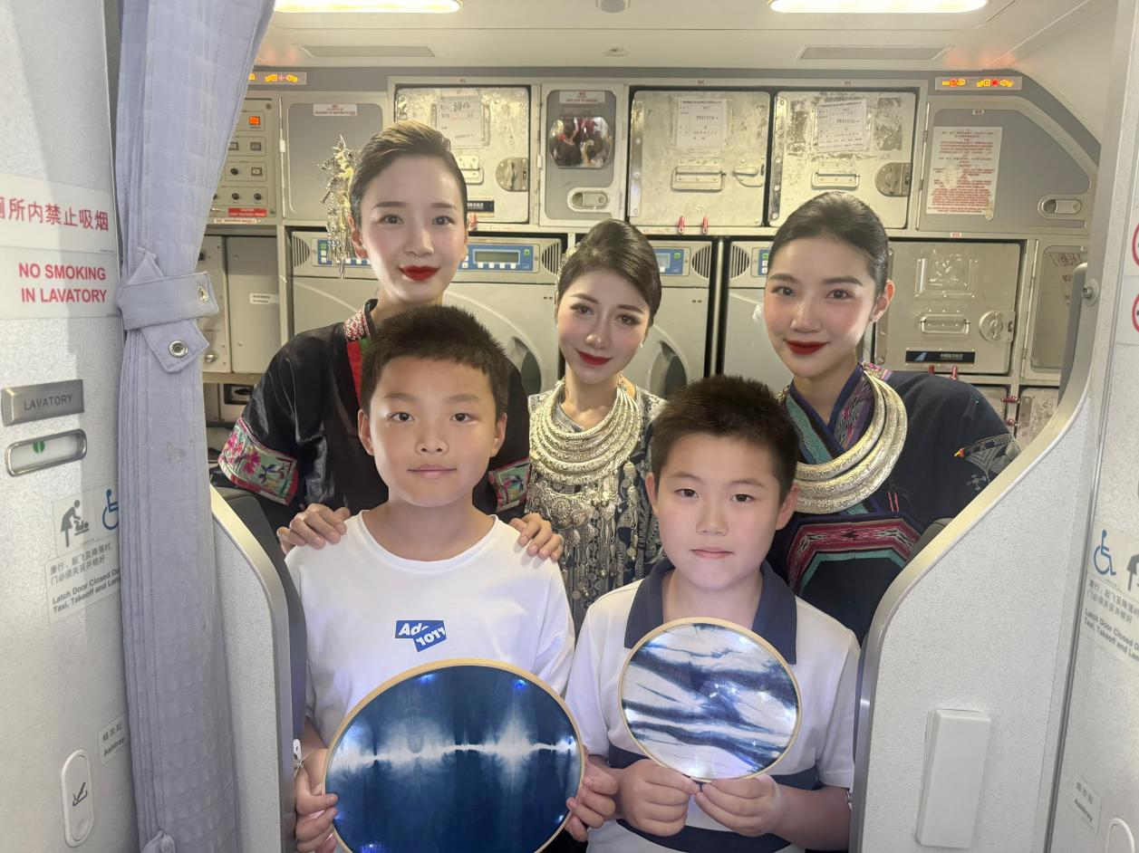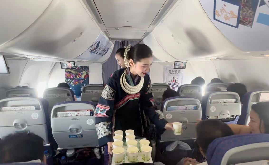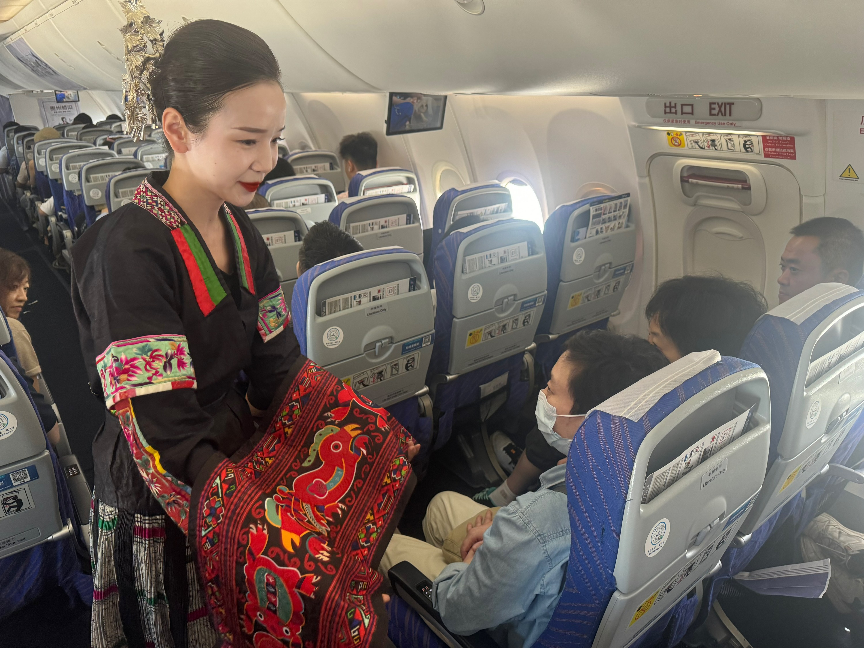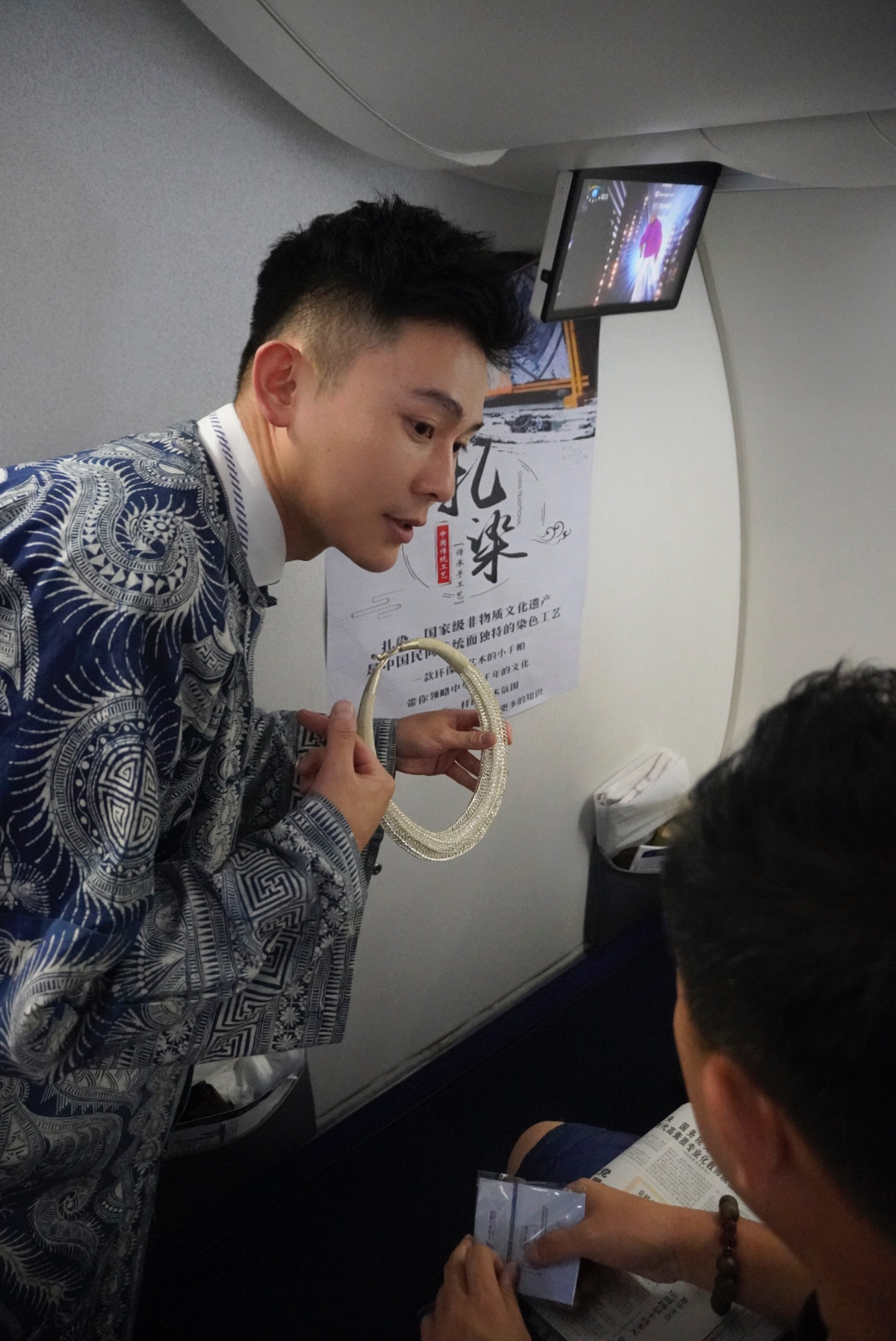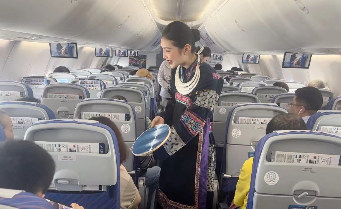 飞行过程中还设置了互动环节。乘务员身着民族服饰,现场演示非遗技艺,让各地游客感受浓厚的文化氛围。