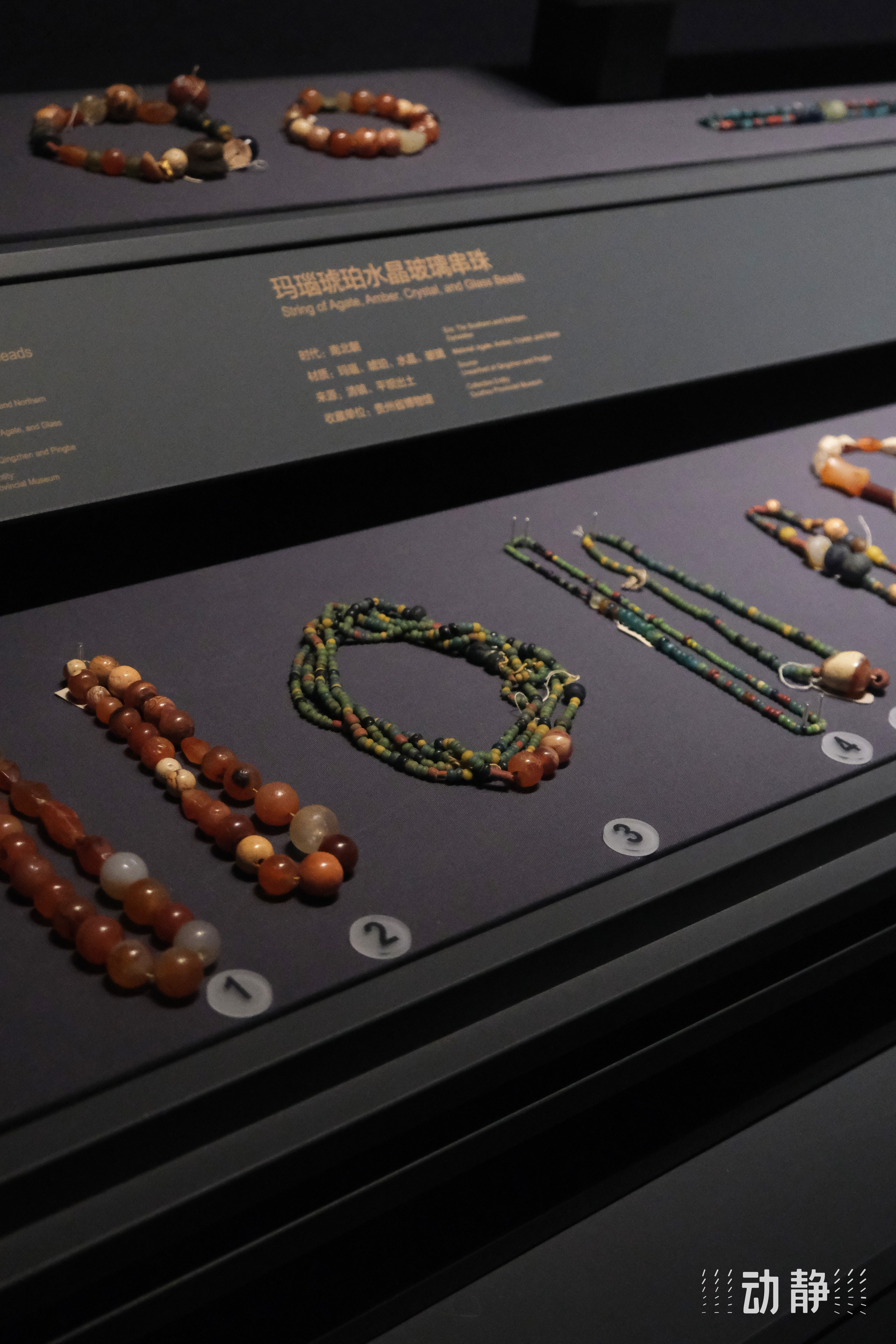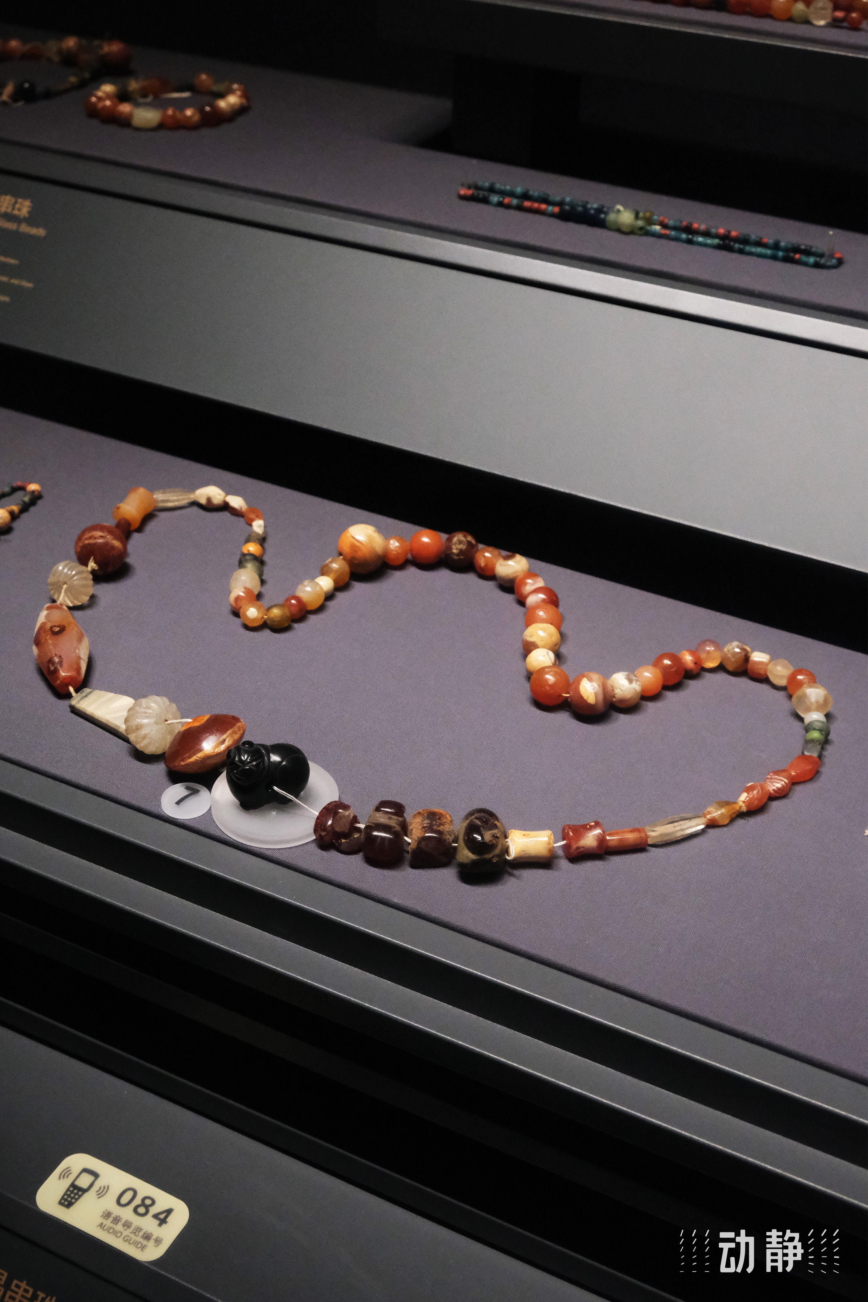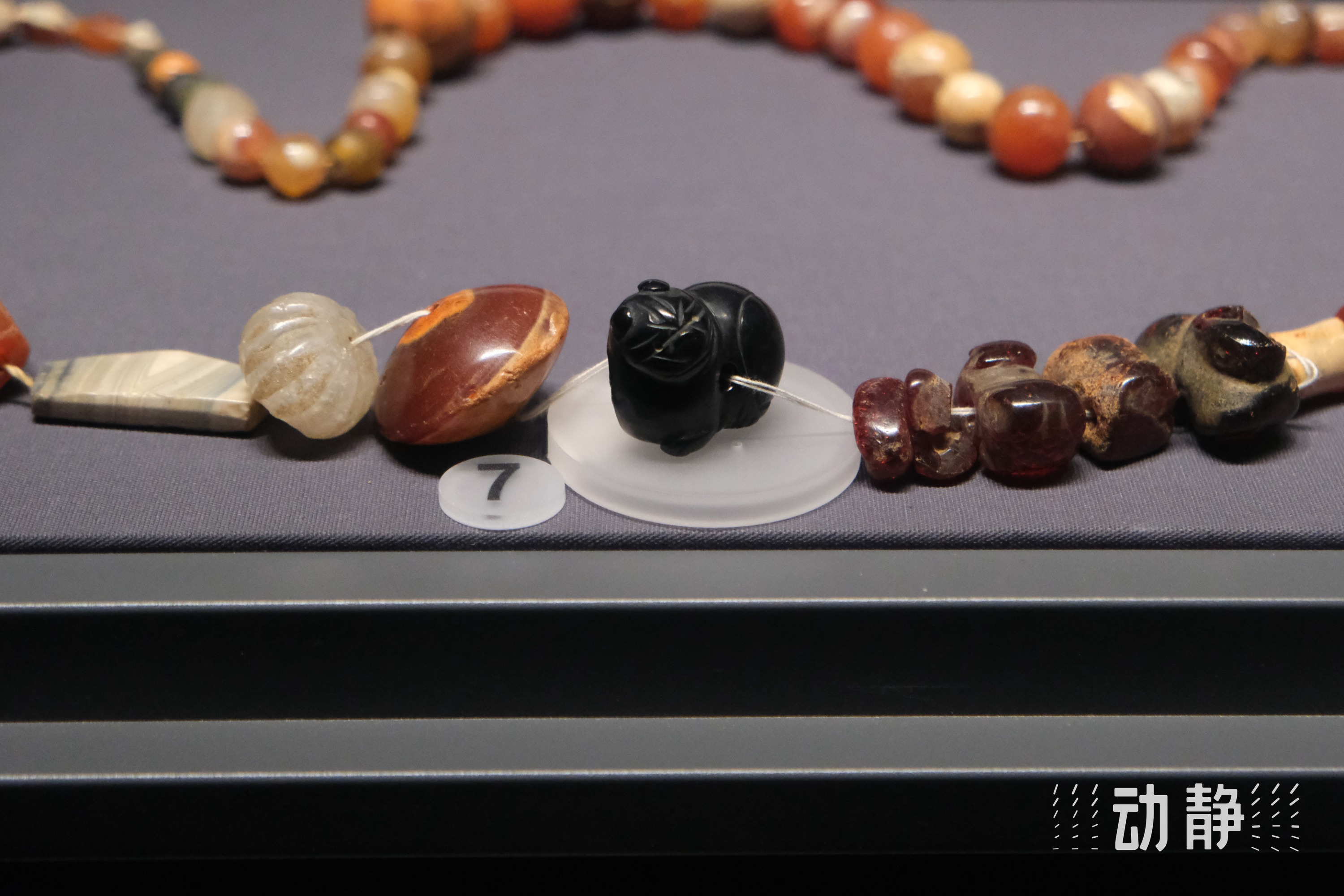 图中的琥珀玛瑙水晶串珠,为一级文物。共56颗,包括玛瑙43颗、琥珀6颗、水晶7颗。形状各异,有圆球形、橄榄形、耳珰形、柱形、蹲兽形等,色彩斑斓。其中琥珀蹲兽造型小巧,工艺精湛。