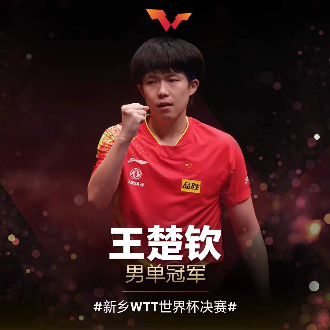 在刚刚结束的新乡WTT世界杯决赛2022男单决赛中,中国队选手王楚钦以4:2击败日本队头号男单张本智和夺得冠军。这也是王楚钦在一个月内继成都世乒赛团体赛、WTT澳门冠军赛之后,获得的第三个冠军。祝贺!