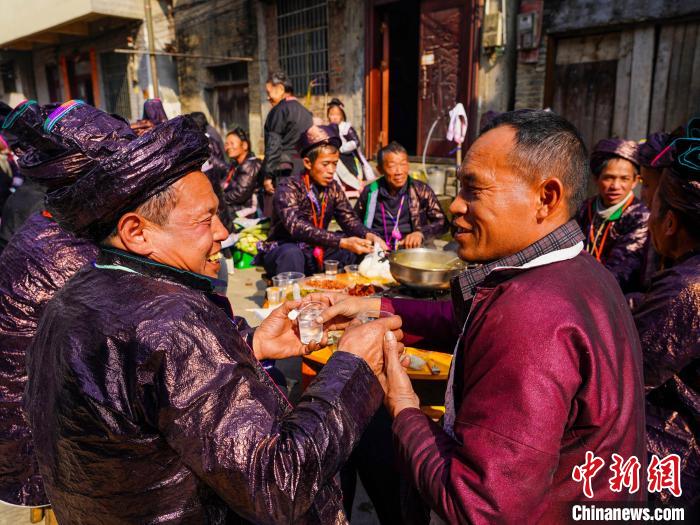 1月15日,贵州省从江县丙妹镇大融村邀请附近村寨的村民一起参加鼓楼庆典,通过开展拦门迎宾、吹奏芦笙、唱侗歌大歌和吃团圆宴等活动,共迎幸福年。图为人们在从江县丙妹镇大融村参加鼓楼庆典活动。卢忠南 摄