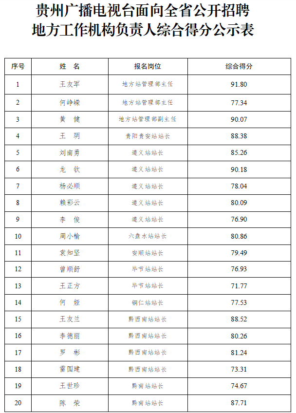 贵州广播电视台面向全省公开招聘地方工作机构负责人,共有22人通过资格审查进入演讲答辩环节,2人因个人原因自愿放弃竞聘资格,实际参加演讲答辩20人。经2022年4月27日现场演讲答辩,4月29日贵州广播电视台台务会议综合评议、贵州广播电视台党委会议研究决定,现将竞聘综合得分和重点考察人选予以公示。