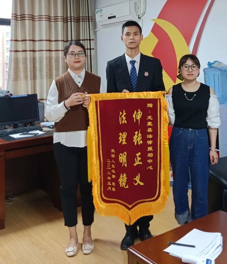 2022年5月9日上午,龙里县法律援助中心收到一面印有“伸张正义,法理明镜”字样的锦旗,同时电话那头受援人张某某不停诉说着心中的感激,“谢谢你们,谢谢法律援助,也感谢国家有这样的好政策,我受伤的这个事情终于有了一个满意的结果。”