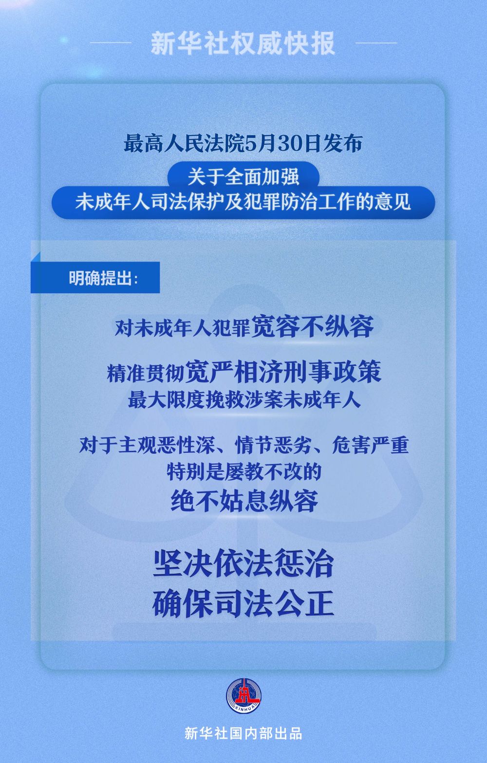 最高人民法院5月30日发布关于全面加强未成年人司法保护及犯罪防治工作的意见,在民事、行政案件中强化未成年人保护和犯罪防治理念,强调对未成年人犯罪宽容不纵容。