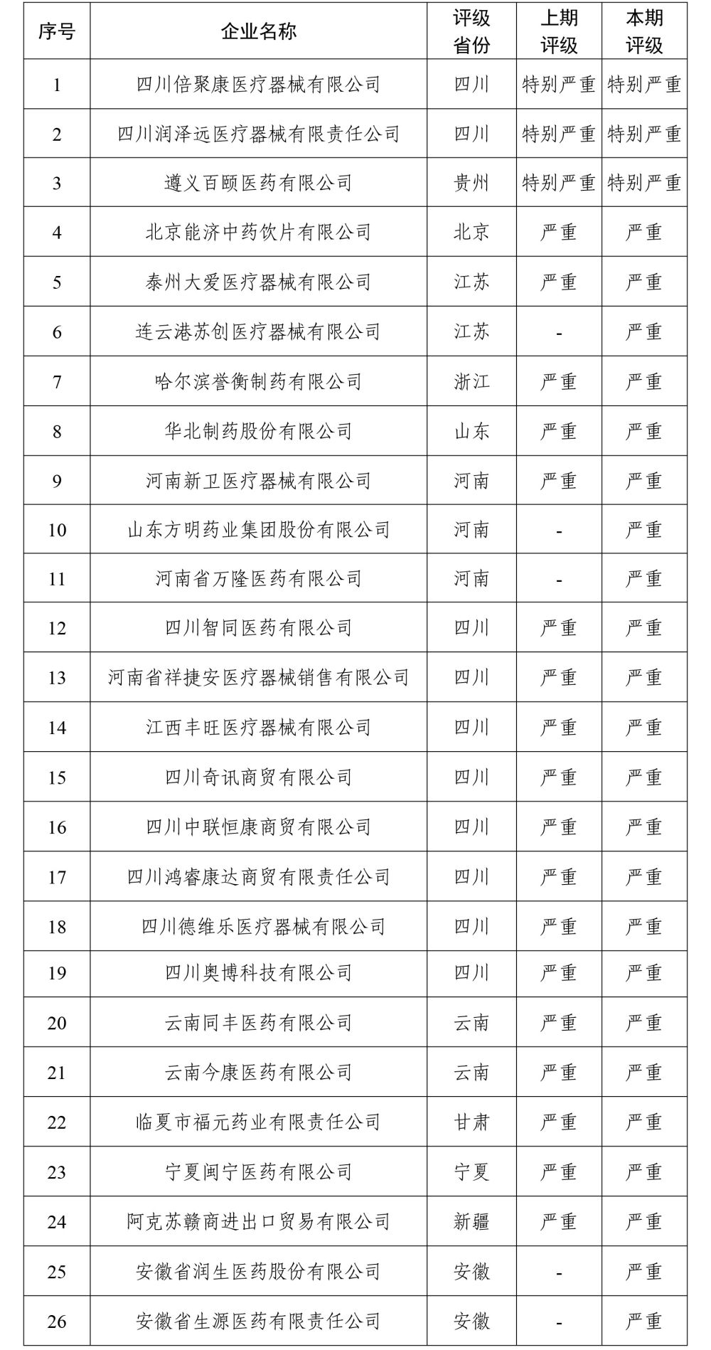 11月20日,国家医保局医药价格和招标采购指导中心发布了各省份评级为“特别严重”和“严重”失信的26家医药企业情况,其中23家医药企业评级为“严重”,3家医药企业评级为“特别严重”。