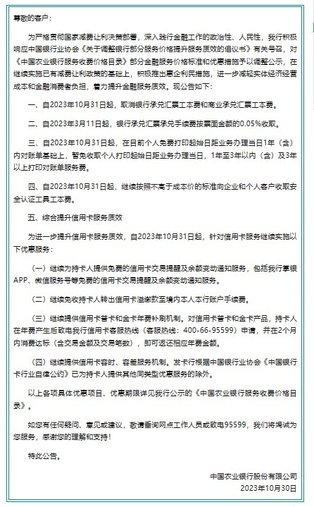 农行公告指出,自2023年10月31日起,继续为持卡人提供免费的信用卡交易提醒及余额变动通知服务;免收持卡人转出信用卡溢缴款至境内本人本行账户手续费;继续提供信用卡普卡和金卡年费补刷机制;继续提供信用卡容时、容差服务机制。
