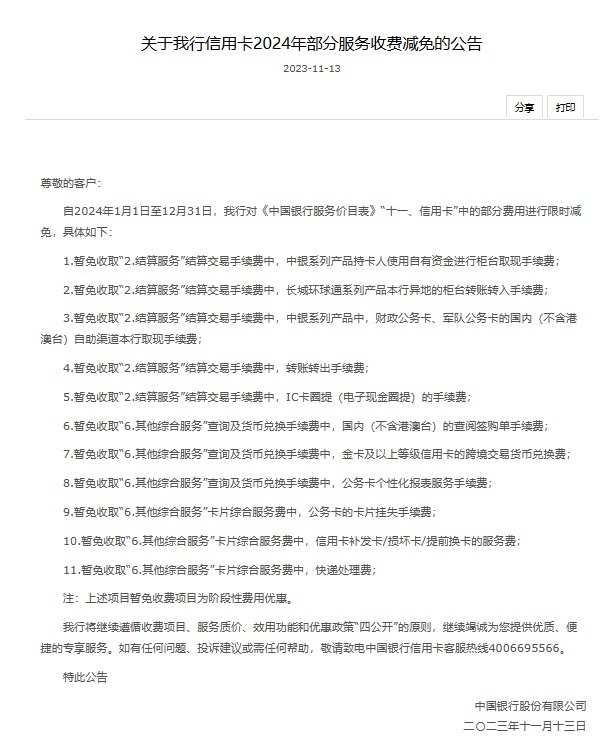 中国银行表示,本次部分费用减免为阶段性费用优惠,时间为2024年1月1日至12月31日。