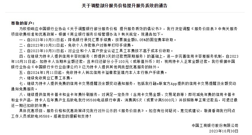 工行公告指出,自2023年10月31日起,如持卡人当期未全额还款,且未归还部分小于100元(或等值外币)时,视同持卡人正常全额还款。