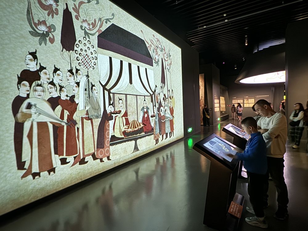 当线上“种草”转为线下“打卡”,科技的赋能更让博物馆体验焕然一新。在太原北齐壁画博物馆,VR技术让游客沉浸式体验北齐贵族的宴饮盛况;互动投影墙上,轻轻拨动手指就能与画中乐伎共奏一曲。来自广东的“90后”游客朱俊机边拍摄穹顶环幕边赞叹:“太震撼了!”