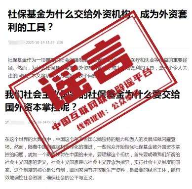 近段时间以来,有少数网络自媒体发布视频称,我国社会保险基金“几乎全部交给外资机构管理”,且被用于“买卖A股”,质疑社保基金成为“外资套利的工具”。经中国互联网联合辟谣平台向有关主管部门核实查证,前述言论均为不实信息。
