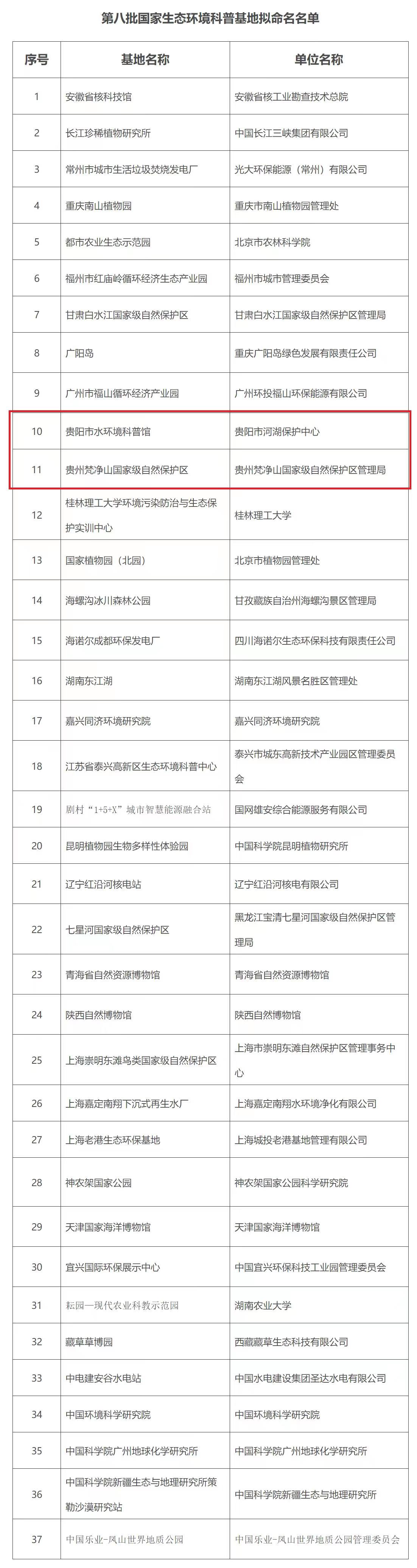 近日,生态环境部与科技部公布了第八批国家生态环境科普基地拟命名名单。全国共有37家单位入选。贵州2地位列其中,分别是贵阳市水环境科普馆和贵州梵净山国家级自然保护区。