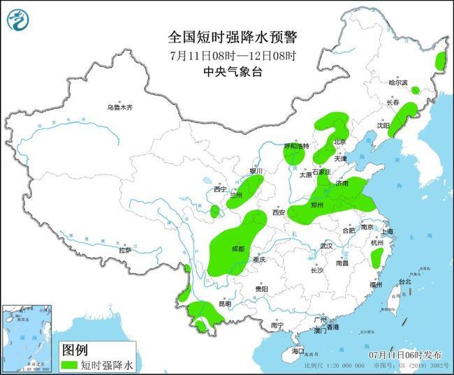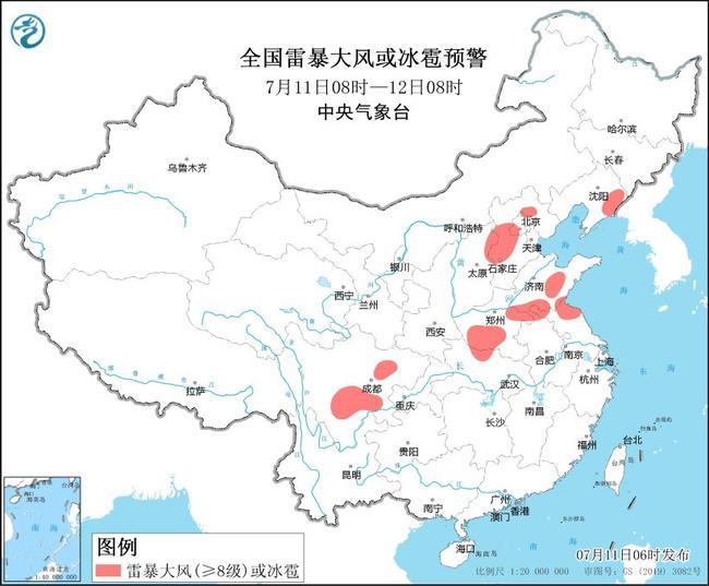 中央气象台7月11日06时继续发布强对流天气蓝色预警:预计7月11日08时至12日08时,辽宁东部、山西北部、河北中部、北京北部和西南部、山东中南部、河南东部和西部、安徽北部、江苏北部、湖北北部、四川东部和中南部等地的部分地区将有8~10级雷暴大风或冰雹天气;内蒙古南部、黑龙江东北部、吉林东部、辽宁东部、青海南部、甘肃南部、宁夏中南部、陕西北部和南部、山西北部、河北中北部和西南部、北京北部和南部、山东中南部、河南、安徽北部、江苏中北部、湖北西北部、浙江南部、四川中东部和南部、云南西部和南部等地的部分地区将有短时强降水天气,小时雨量30~50毫米,局地可达60毫米以上。