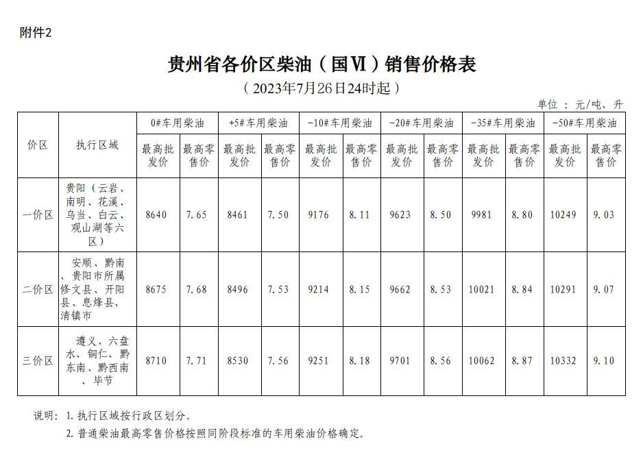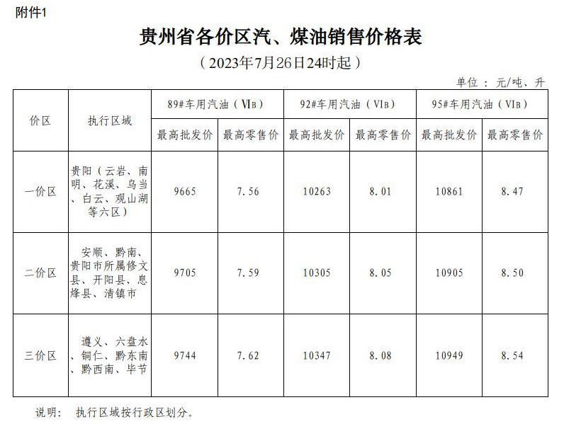 根据国家成品油价格形成机制,国家发展改革委决定自2023年7月26日24时起上调国内成品油价格。按照国家调整要求和相关规定,贵州省89#汽油(国VIB)、0#柴油价格每吨在现行标准基础上分别提高275元和260元,具体价格可由各经营企业在不超过最高批发、零售价格的前提下确定。调整后各油品最高价格见附件。