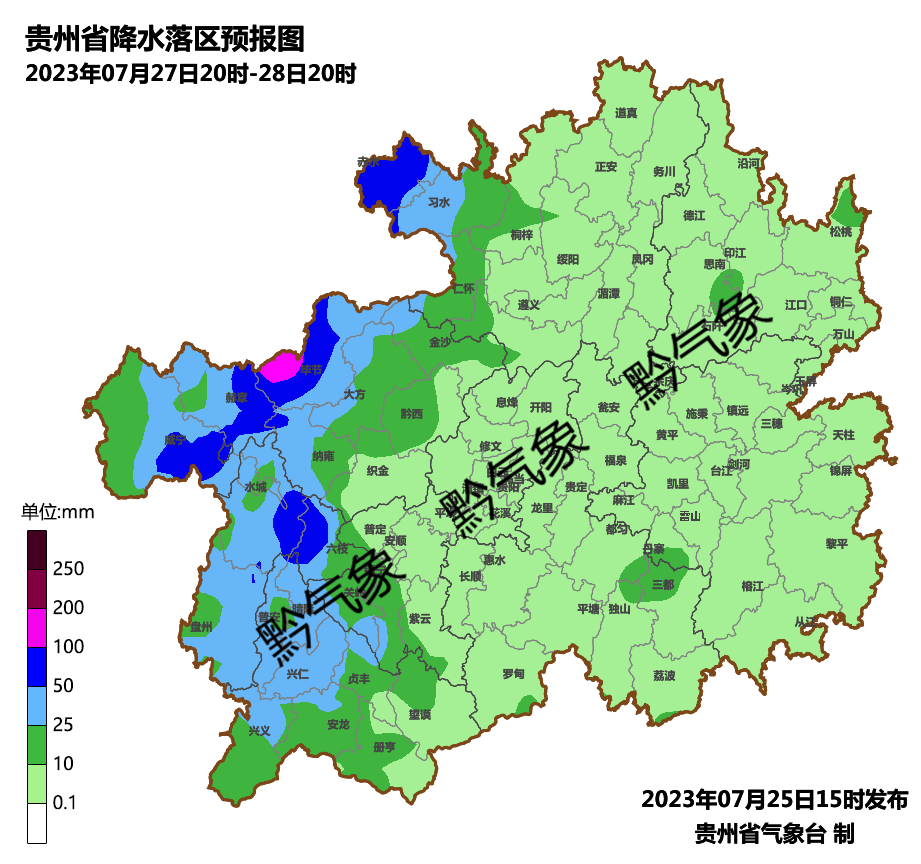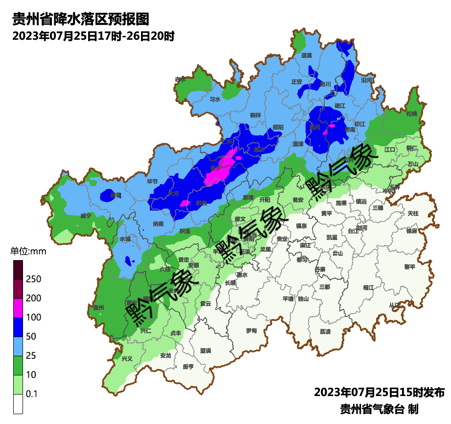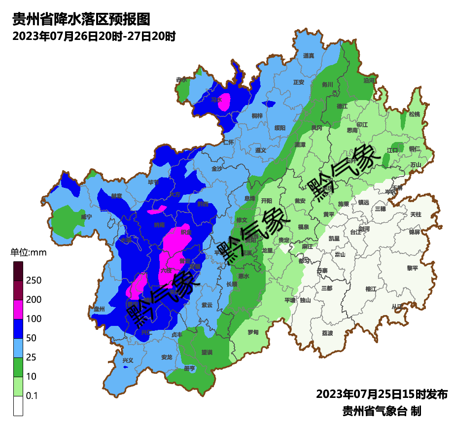 今天傍晚到明天白天,省的西部和北部阴天间多云有阵雨或雷雨,雨量中到大雨,毕节市大部、遵义市南部和东部、铜仁市西部和北部的局部地区有暴雨,部分乡镇有大暴雨,其余地区多云有分散阵雨或雷雨,东部和南部边缘的部分市县午后有35℃及以上高温天气;