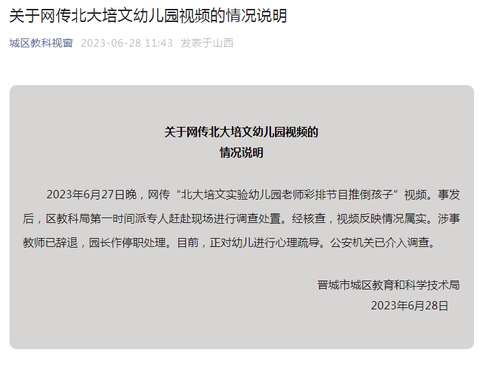 2023年6月27日晚,网传“北大培文实验幼儿园老师彩排节目推倒孩子”视频。事发后,区教科局第一时间派专人赶赴现场进行调查处置。经核查,视频反映情况属实。涉事教师已辞退,园长作停职处理。目前,正对幼儿进行心理疏导。公安机关已介入调查。