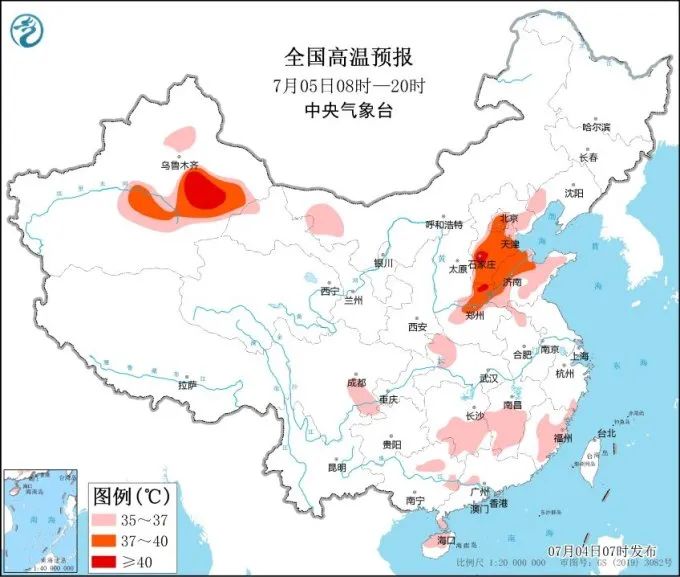 高温方面,受降雨影响华北大部高温天气得到短暂缓解,明天起(5日)京津冀及黄淮等地高温将再度发展加强,河北大部、北京、天津、山东北部、河南中北部等地日最高气温可达37~39℃,部分地区超过40℃。