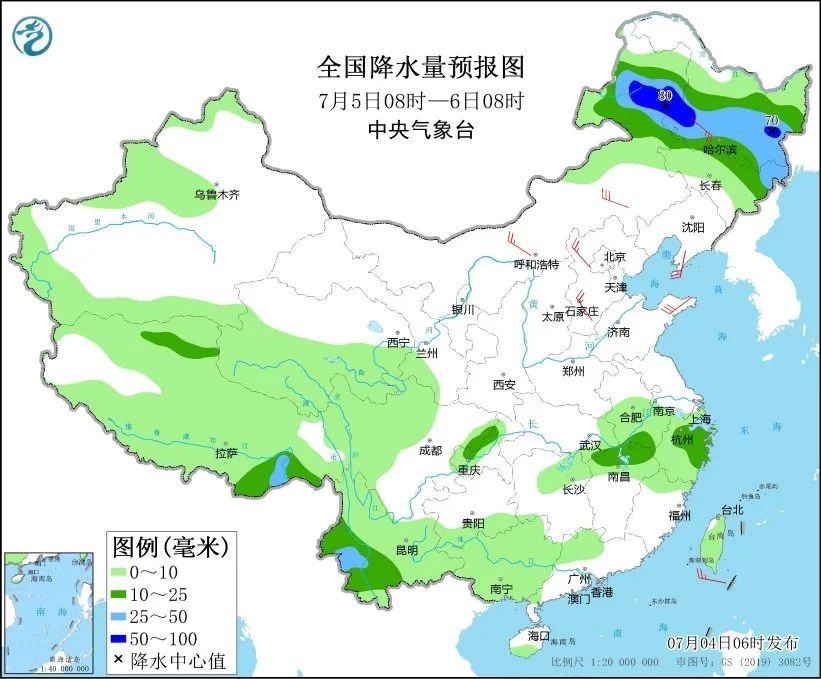 5日,内蒙古东部、黑龙江中南部、吉林北部、云南西部和南部、江西北部、浙江北部等地部分地区有中到大雨,其中,内蒙古东北部、黑龙江西南部等地局地有暴雨。