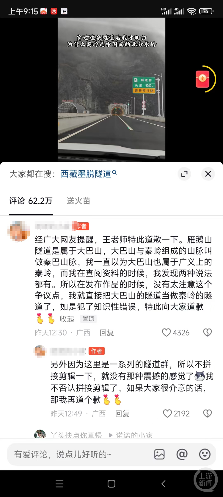记者随后私信了原视频作者王先生,他并未回复信息。不过2月22日他在原视频评论区发布了道歉评论:“经广大网友提醒,王老师特此道歉。雁鹅山隧道是属于大巴山,大巴山与秦岭组成的山脉叫秦巴山脉。我一直以为大巴山也属于广义上的秦岭,而我在查阅资料的时候,发现这两种说法都有。所以在发布作品的时候,没有太注意这个争议点,直接把大巴山的隧道当做了秦岭的隧道了。如是犯了知识性错误,特此向大家道歉。”