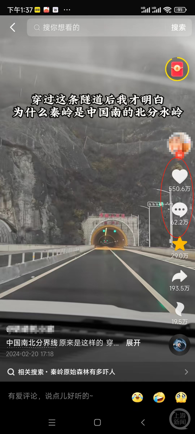 王先生发布的秦岭隧道视频,引发550万人点赞、62.2万人评论。