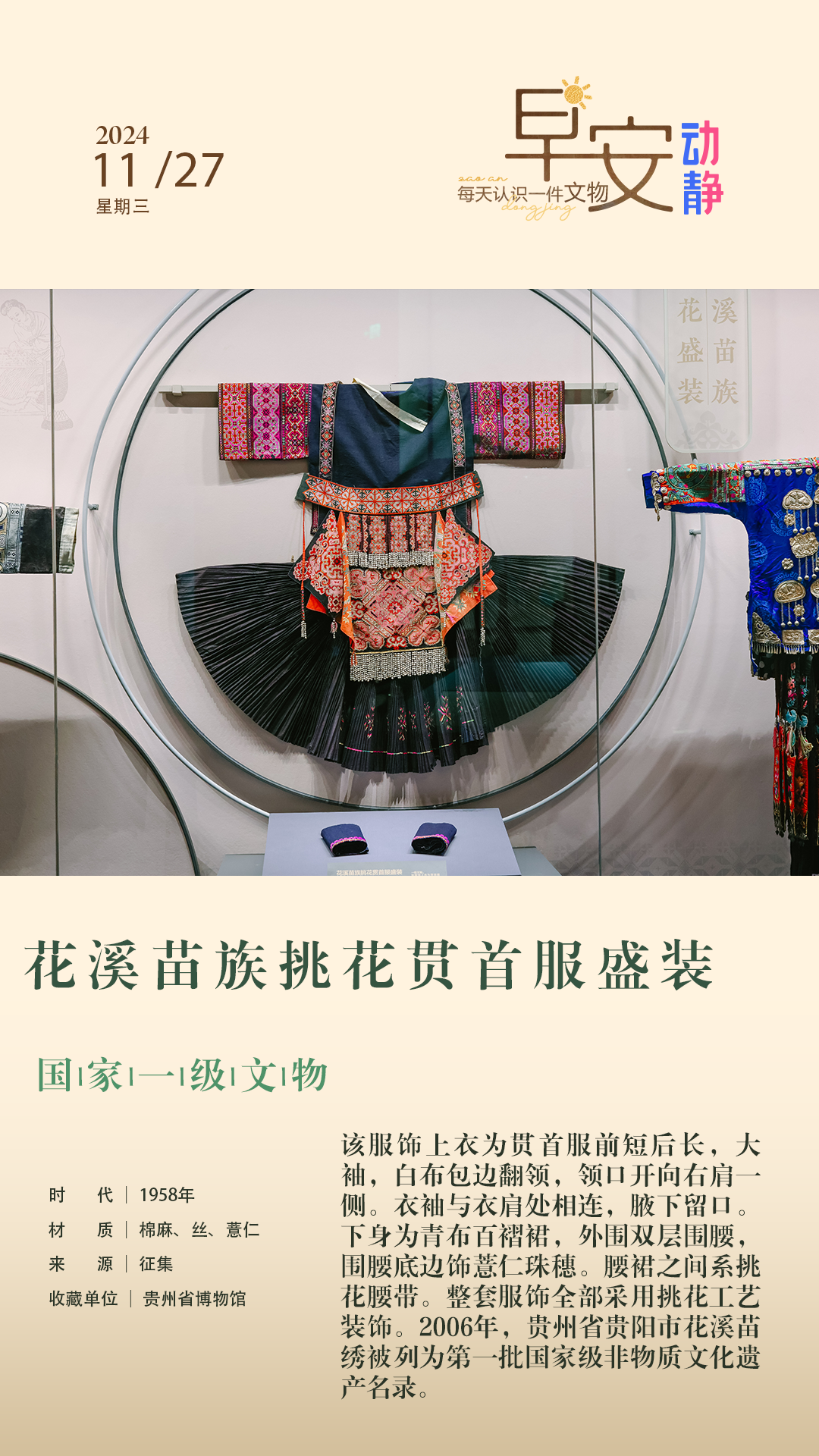 贯首服的造型是花溪苗族挑花盛装的一大特色。它的领口前短后长,前领口呈弧形,后领口稍高,穿着时将衣服从头部套下,两肩处自然下垂,形成一种独特的穿着效果。