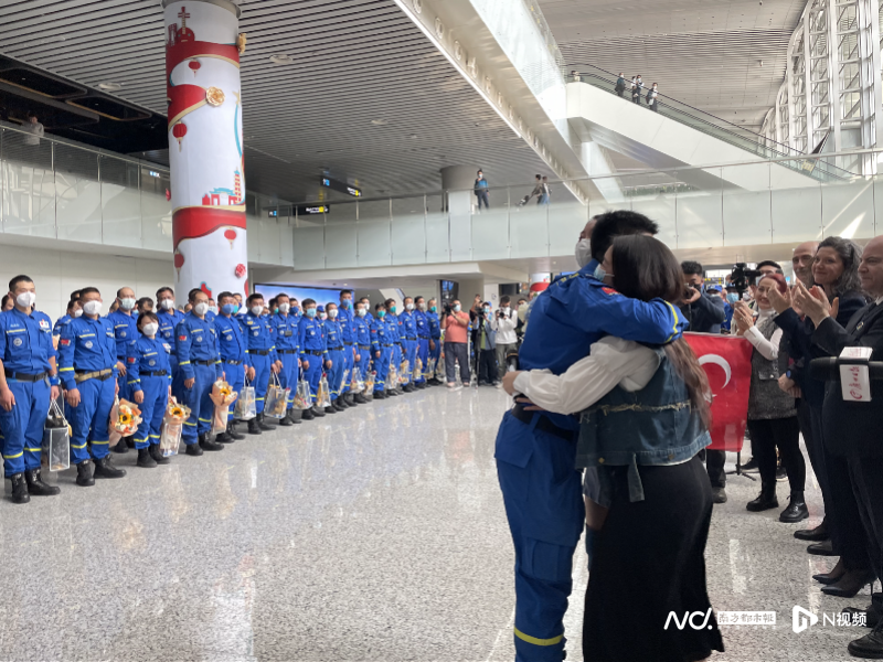 “欢迎回家!”19日14时许,伴随着现场的欢呼声和掌声,129名救援队员走出机场到达口。土耳其共和国驻广州总领事馆人员向救援队的回国队员赠送鲜花,并用中文和英文表示感谢。有回国的救援队员不断擦拭眼中的热泪,库特鲁·阿义坎上前与他相拥,场面令人动容。