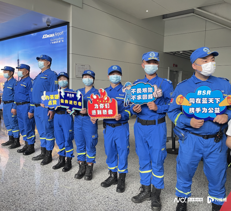 南都记者在广州白云国际机场看到,蓝天救援队接机队员面对面排成两列,迎接从土耳其回国的队友。有的接机队员举着写有“为英雄点赞”“不畏艰险不求回报”等欢迎牌子,救援队员的家属手捧鲜花紧张地等待着。