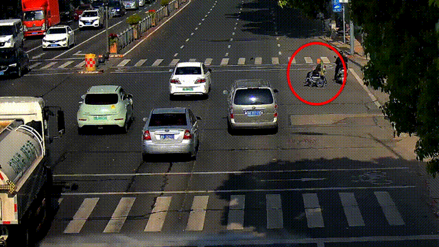 正乘坐着轮椅等待绿灯
