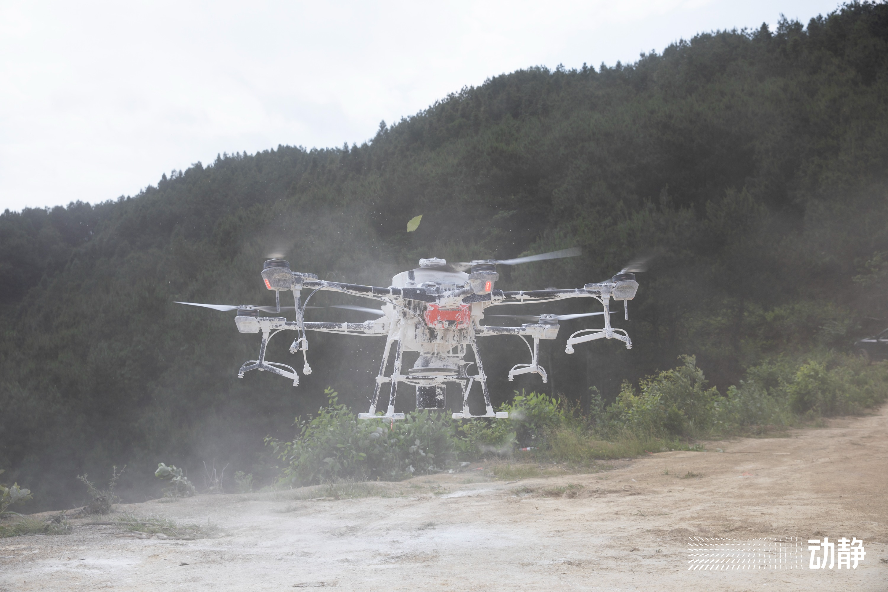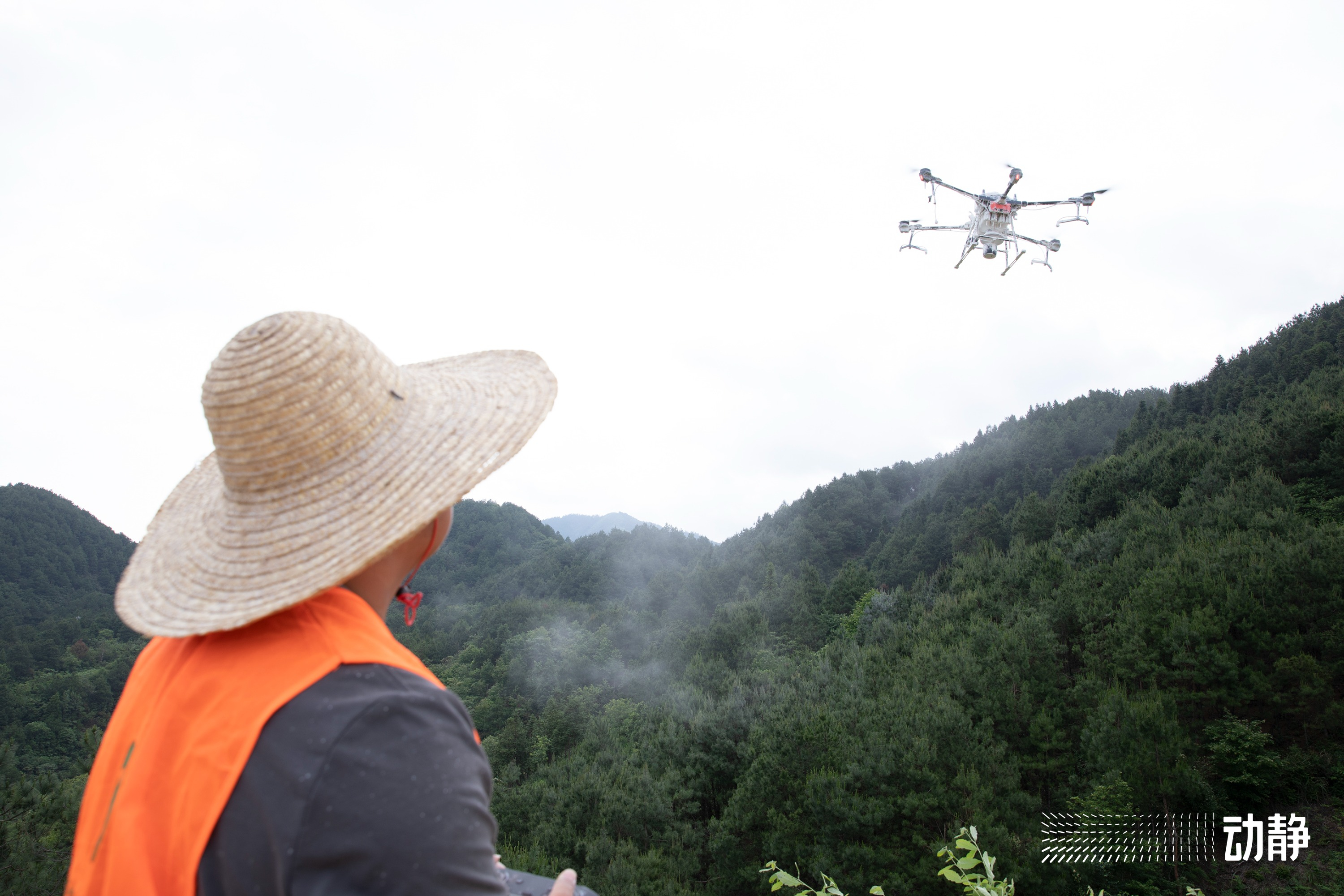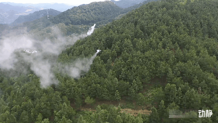 “嗡……嗡……”,在技术人员的操控下,两台满载药剂的植保无人机飞向丛林。随着摇杆闸门的打开,防虫药剂犹如泄洪般,飘洒在丛林间,对松材线虫病进行防治。