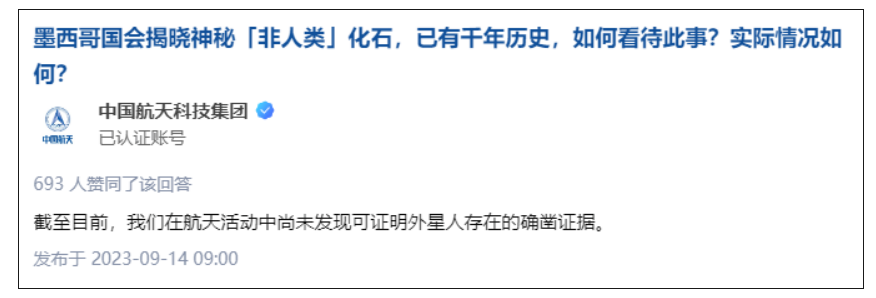9月14日,中国航天科技集团在知乎回答有关墨西哥两具疑似“外星生物”遗骸亮相的提问称,“截至目前,我们在航天活动中尚未发现可证明外星人存在的确凿证据。”