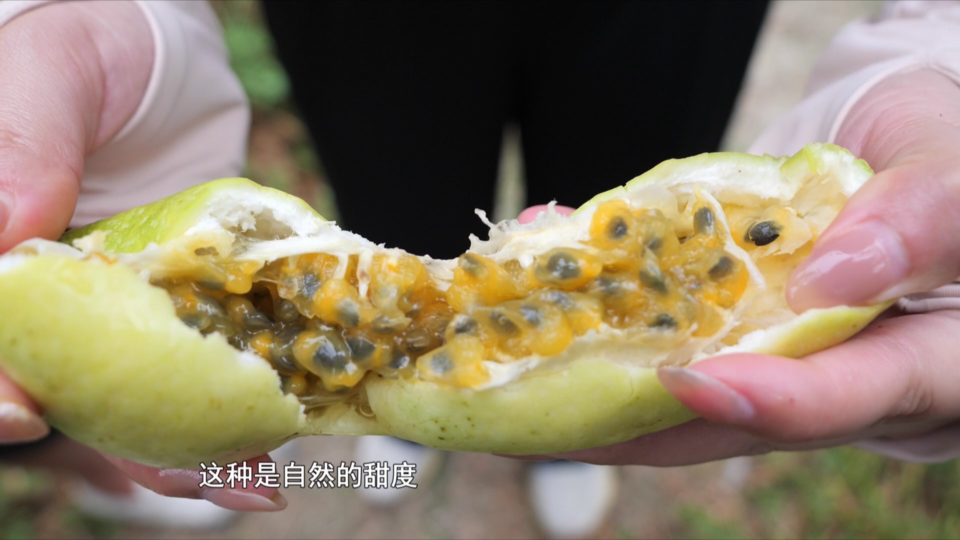 走进果园,只见百香果树枝上挂满一个个黄灿灿的小灯笼,长势喜人,凑近一闻,一股淡淡的清香扑鼻而来。剥开外皮,香气馥郁,连着果瓤一起吃掉,瞬间满口爆汁,一口尝尽多种风味。