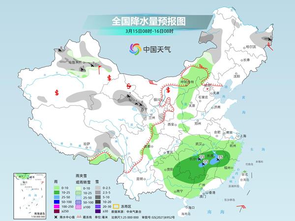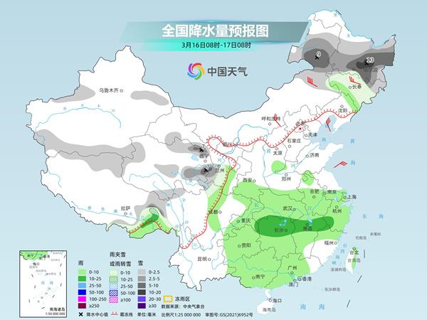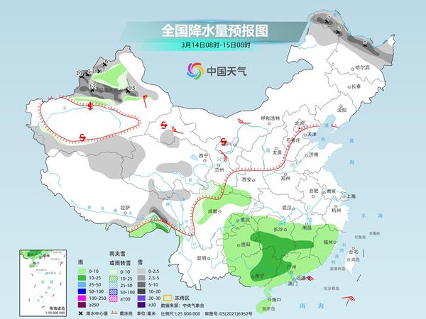明天,内蒙古中东部、黑龙江东北部、新疆沿天山地区、西藏南部和东部、青海北部、甘肃河西、宁夏南部等地部分地区有小到中雪或雨夹雪,其中,黑龙江东北部、新疆沿天山地区、青海北部和东部等地部分地区有大雪(5~8毫米)。陕西北部、山西北部、江汉大部、江南、华南大部等地部分地区有小到中雨,其中,湖南东部、江西中北部等地部分地区有大雨(25~35毫米)。