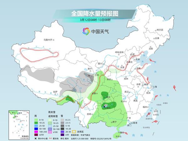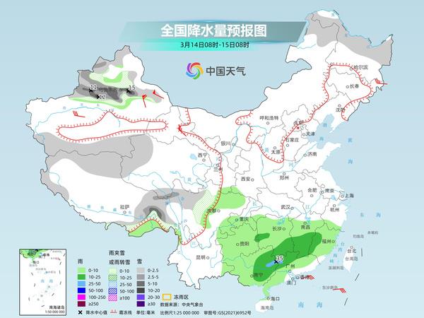 后天,新疆沿天山地区、西藏东部、青海西部和东南部、川西高原北部等地部分地区有小到中雪或雨夹雪,其中,新疆沿天山地区和伊犁河谷、西藏东部等地部分地区有大雪,局地暴雪(10~15毫米)。江南大部、西南地区东部、华南大部等地部分地区有小到中雨,其中,广西东北部、广东西北部等地部分地区有大雨。