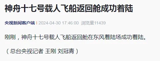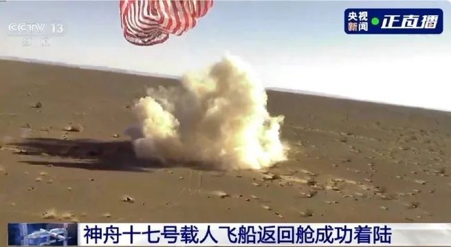 据央视新闻客户端消息,刚刚,神舟十七号载人飞船返回舱在东风着陆场成功着陆。