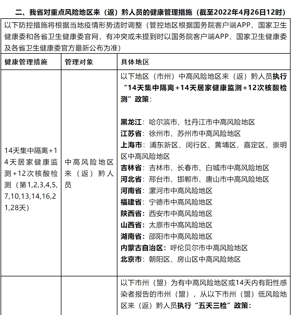 为精准做好“外防输入、内防反弹”工作,有效控制和降低新冠肺炎疫情传播风险,现将我省对重点地区来(返)黔人员的健康管理措施提示如下。