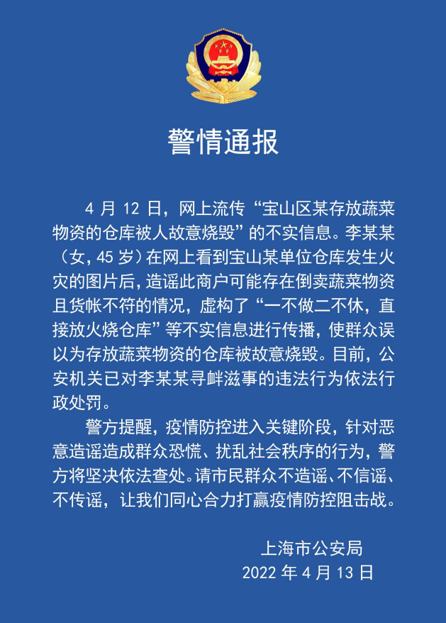 4月12日,网上流传“宝山区某存放蔬菜物资的仓库被人故意烧毁”的不实信息。李某某(女,45岁)在网上看到宝山某单位仓库发生火灾的图片后,造谣此商户可能存在倒卖蔬菜物资且货账不符的情况,虚构了“一不做二不休,直接放火烧仓库”等不实信息进行传播,使群众误以为存放蔬菜物资的仓库被故意烧毁。目前,公安机关已对李某某寻衅滋事的违法行为依法行政处罚。