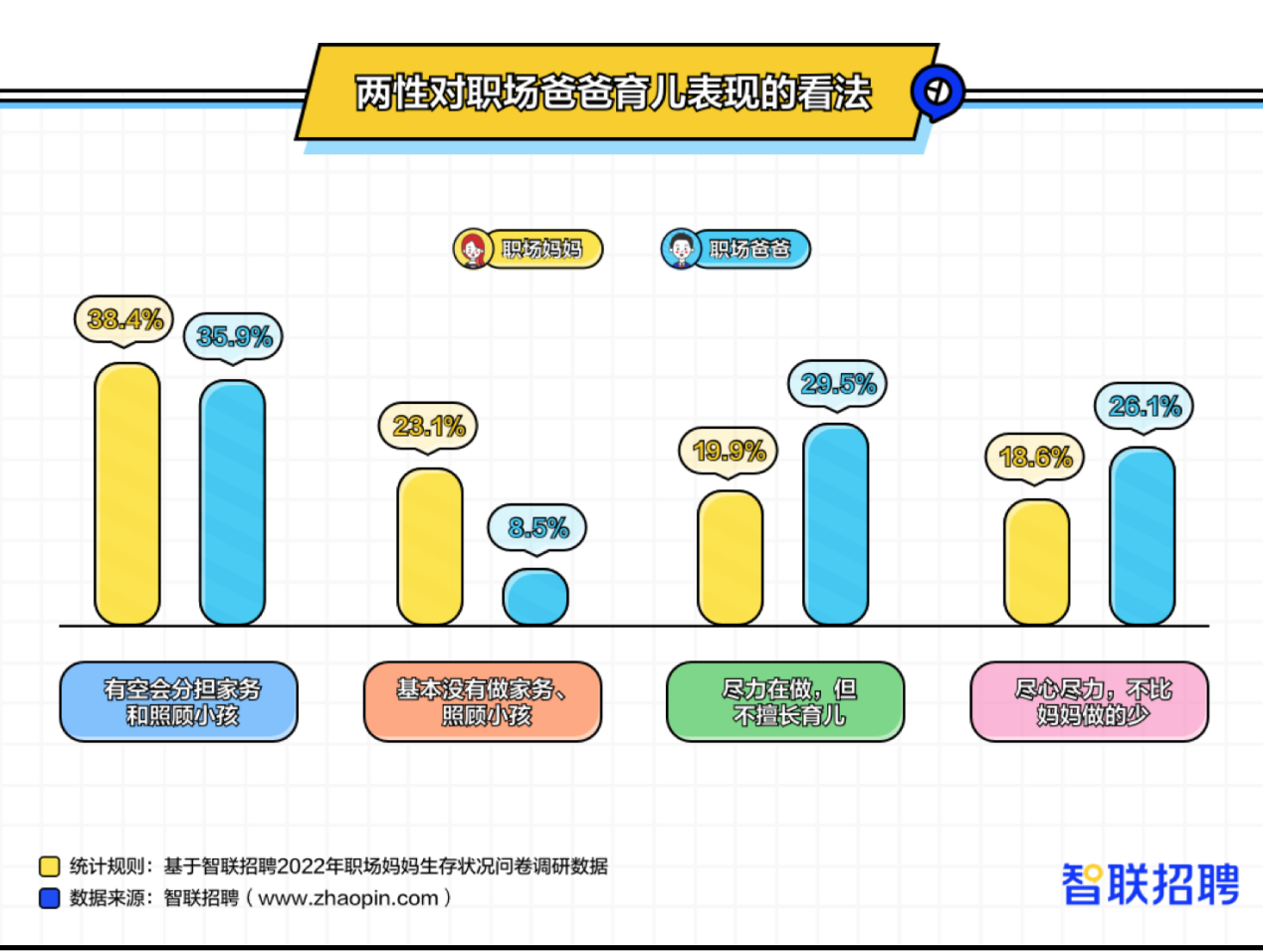 据智联招聘数据统计,38.4%的职场妈妈表示配偶“有空会分担家务和照顾小孩”,占比最高。但是也有23.1%的职场妈妈表示丈夫“基本没有承担家务、照顾小孩的责任”。这表明,超2成职场妈妈感到自己正在经历“丧偶式”育儿。