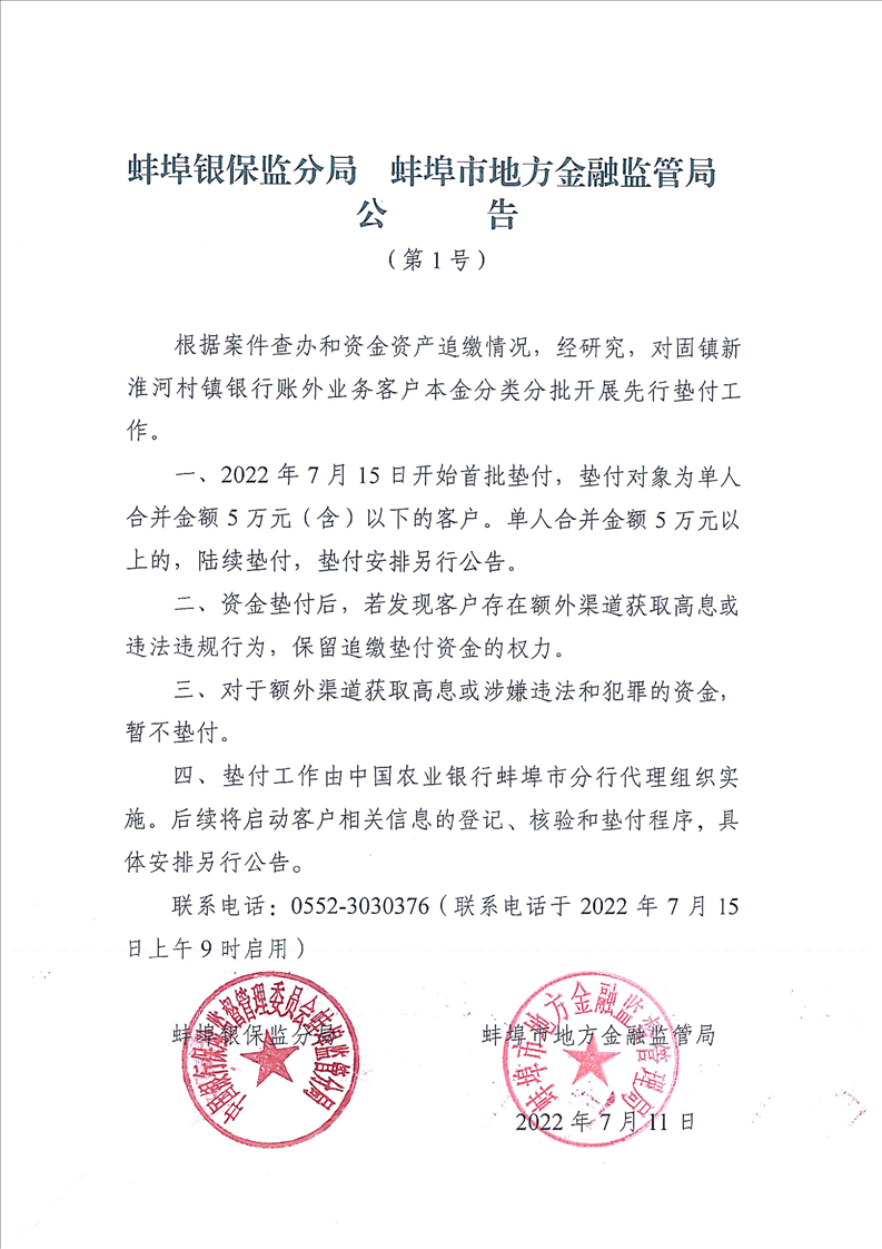 四、垫付工作由中国农业银行蚌埠市分行代理组织实施。后续将启动客户相关信息的登记、核验和垫付程序,具体安排另行公告。