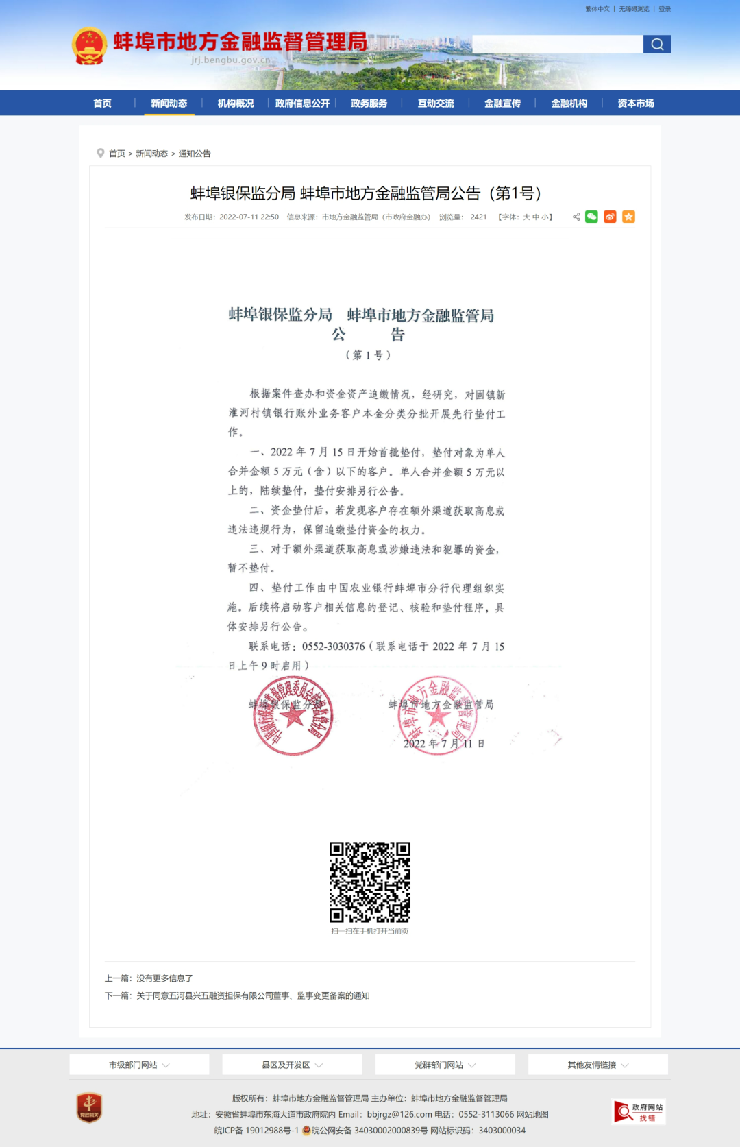 7月11日,安徽省蚌埠市地方金融监督管理局发布公告。全文如下: