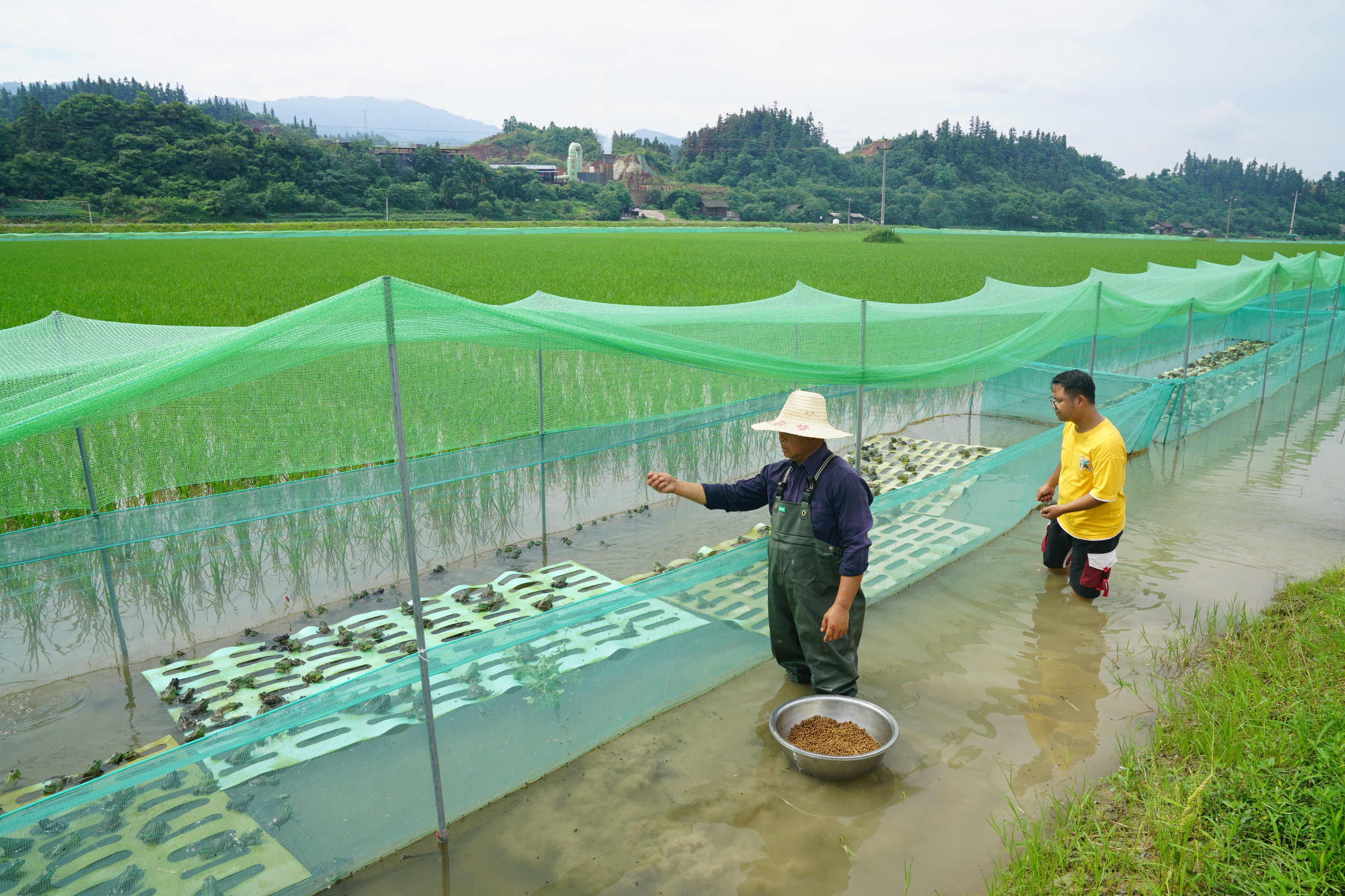 牛蛙养殖利用田边做长排蛙箱,同时牛蛙还能吃掉稻田里的蚊虫,减少水稻病虫害,从而达到绿色防治的效果。稻田里放养稻花鱼,待到水稻成熟,鱼能吃到田里掉落的稻花,真正实现“稻谷香、鱼蛙肥”。